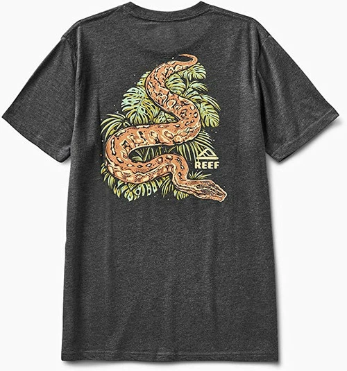 with a snake slithering through leaves among a slightly distressed REEF logo. Soft, 100% cotton jersey keeps you peacefully chill.