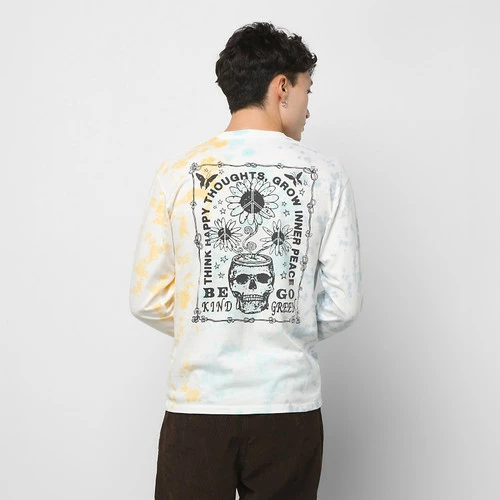 A laid-back tie-dyed print pairs with skull graphics on the Think Happy Tie Dye Long Sleeve T-Shirt. Made with heavier weight cotton, this crewneck tee reminds you to stop worrying and find your happy place. Fit type: classic. Model is 6 feet tall and wearing a size Medium. • 100% carded ringspun cotton • Crewneck t-shirt • Long sleeves • Allover tie dye • Screen printed art at left chest and back • Fit type: classic